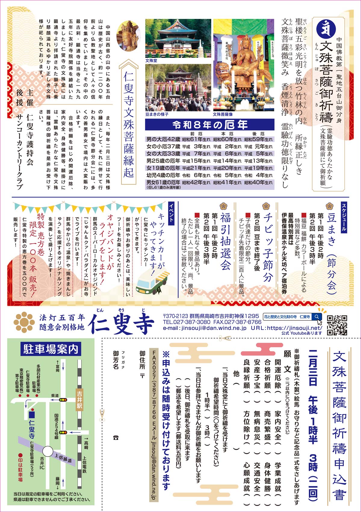 室町時代大永二年(1522年)に創建されました。当山境内には数多くの門や堂が配置よく建立され、県内屈指の伽藍配置を誇り曹洞宗の霊場の峻厳な雰囲気が漂ってきます。群馬は上毛三山(赤城、榛名、妙義)をはじめとする秀麗な山々と数多くの温泉を誇る自然の豊かな地です。そんな群馬と共に歩んできた仁叟寺にようこそ。年間を通しての心温まる行事の数々、落ち着いた坐禅堂にての坐禅会も行っております。