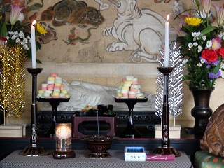 | 毎年、2月15日に、釈迦の入滅(亡くなられること)の供養として、「涅槃会(ねはんえ)」が行われる。 誕生日であり花祭りの「降誕会(ごうたんえ)」【4月8日】、お悟りを開かれとする「成道会(じょうどうえ)」【12月8日】とともに三仏忌と呼ばれ、宗派を超えて寺院では供養の儀式が執り行われる。 法要は、2月1日から晩課とよばれる午後の諷経で行い、涅槃図を掲げ、『仏遺教経』を読誦する。涅槃図とは、釈迦が沙羅双樹(さらそうじゅ)の下で涅槃に入った際の、頭を北にして西を向き右脇を下にした姿で臥し、周囲に十大弟子を始め、諸菩薩、天部や獣畜、虫類までもが嘆き悲しむさまを描いた図である。ほかにも、涅槃団子とよばれる五色の餅を供え、それを食すことも、涅槃会の際に行っている。 |